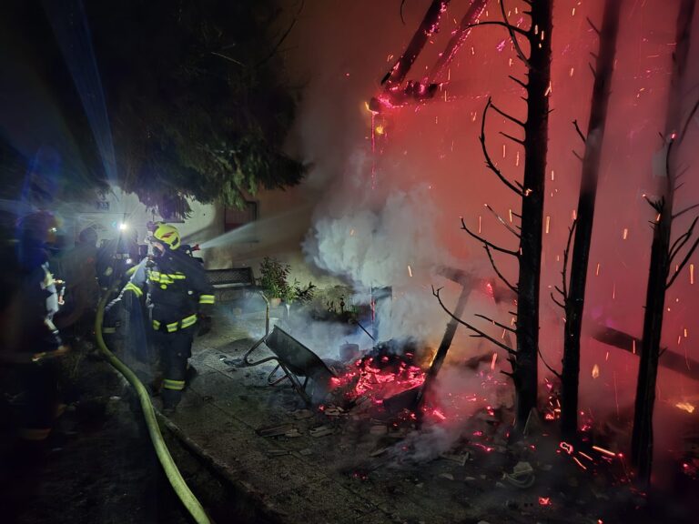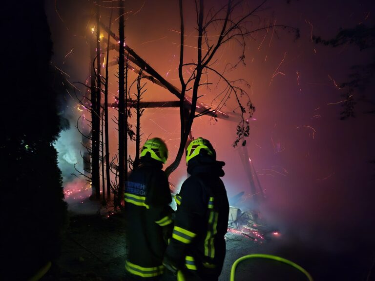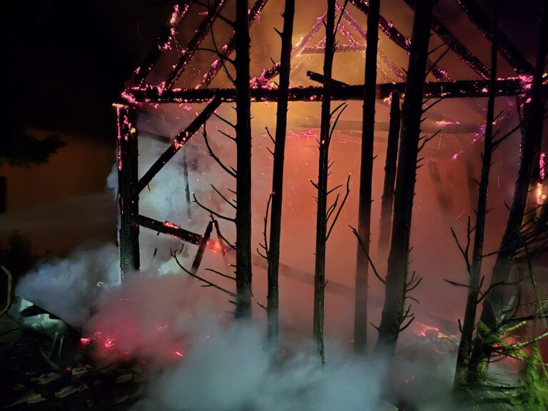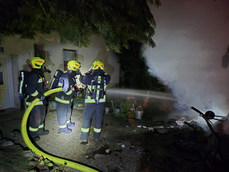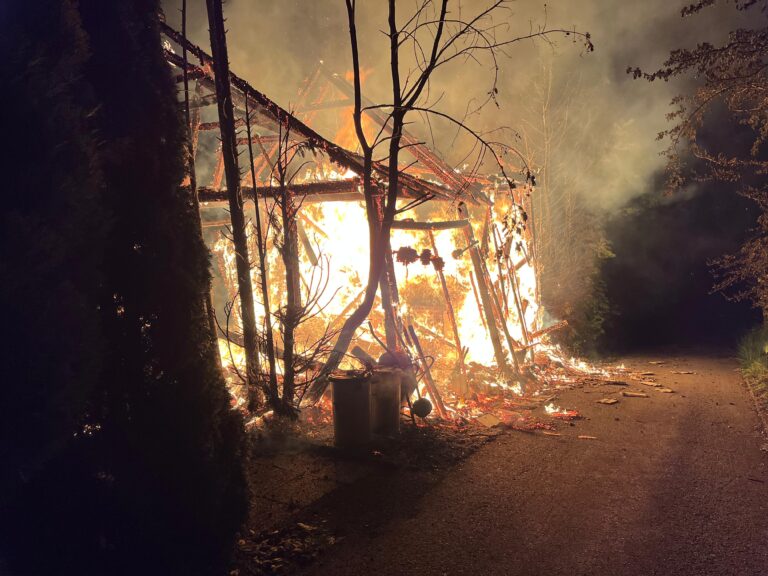 Bereits auf der Anfahrt war der Feuerschein deutlich sichtbar – vor Ort stand ein Nebengebäude in Vollbrand. Durch den starken Funkenflug drohte das Feuer auf das angrenzende Wohnhaus überzugreifen.