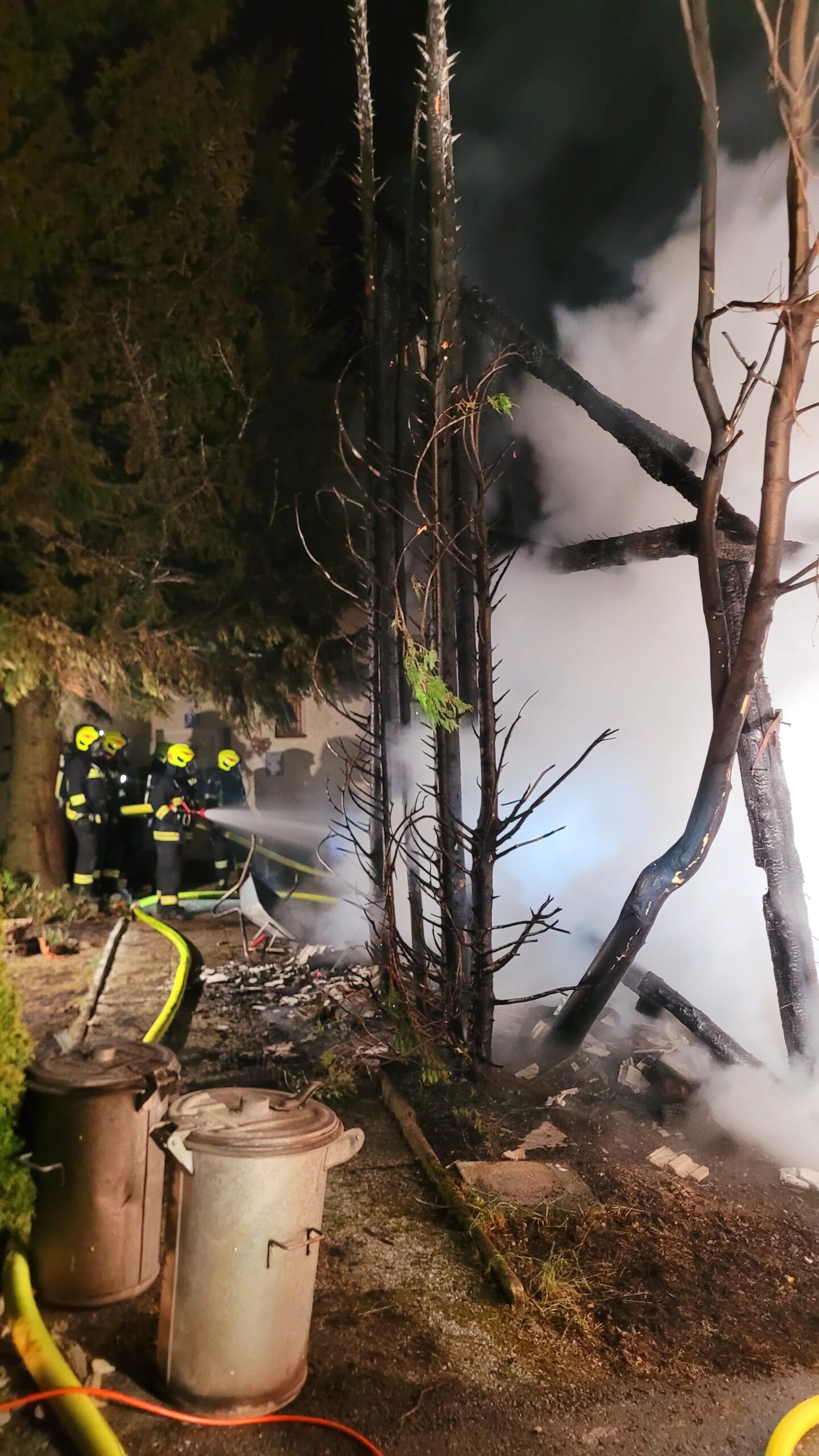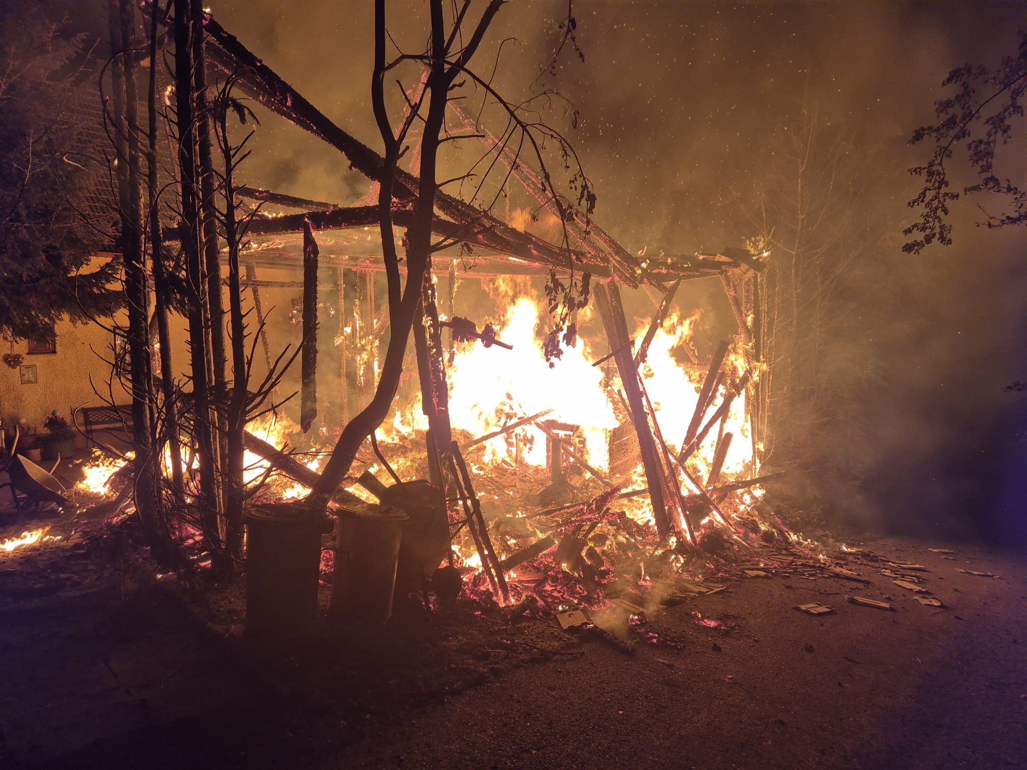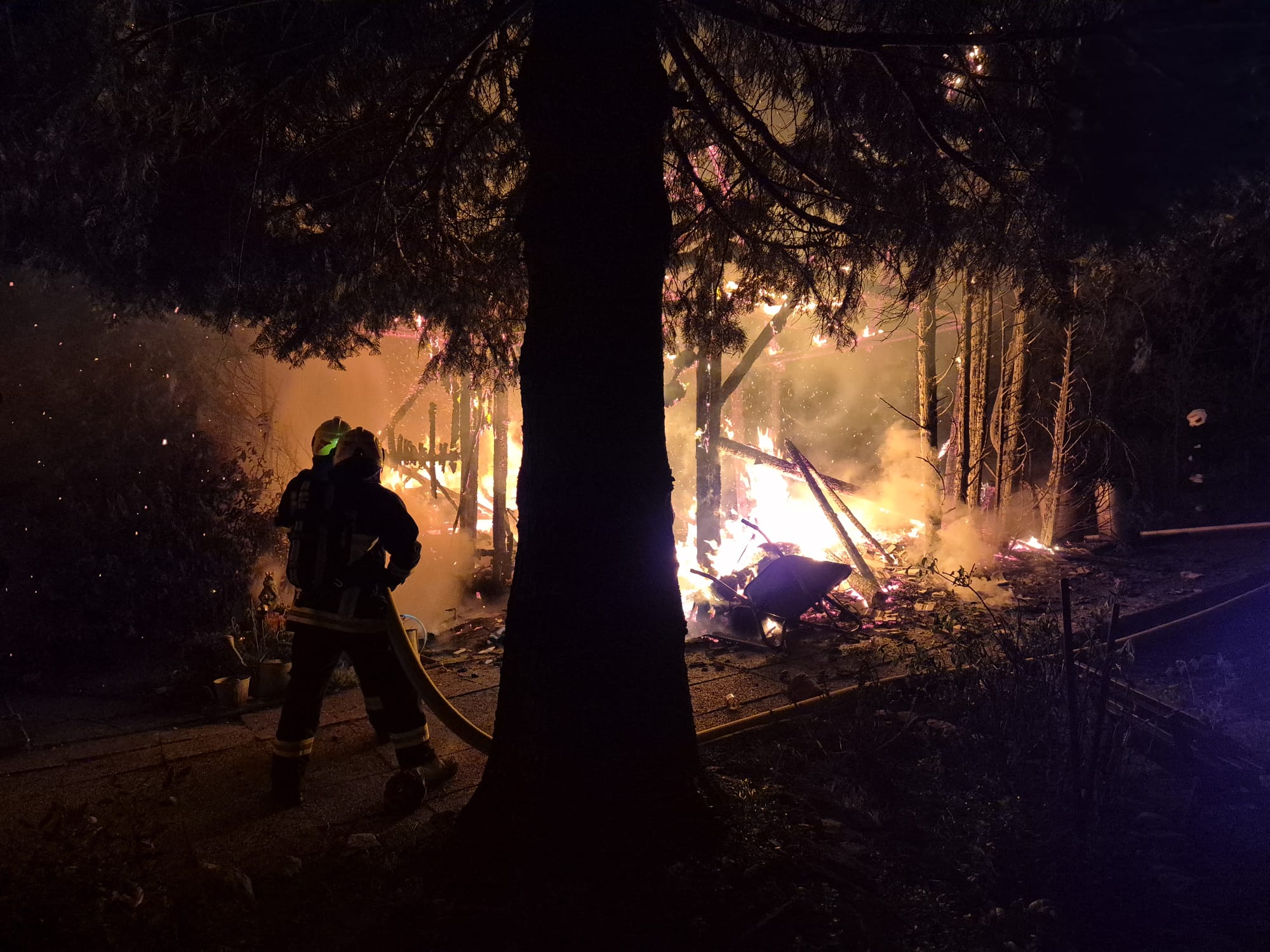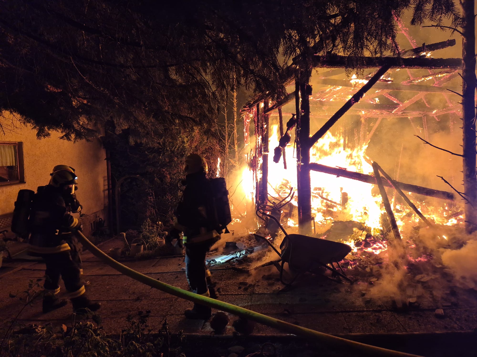 Bereits auf der Anfahrt war der Feuerschein deutlich sichtbar – vor Ort stand ein Nebengebäude in Vollbrand. Durch den starken Funkenflug drohte das Feuer auf das angrenzende Wohnhaus überzugreifen.